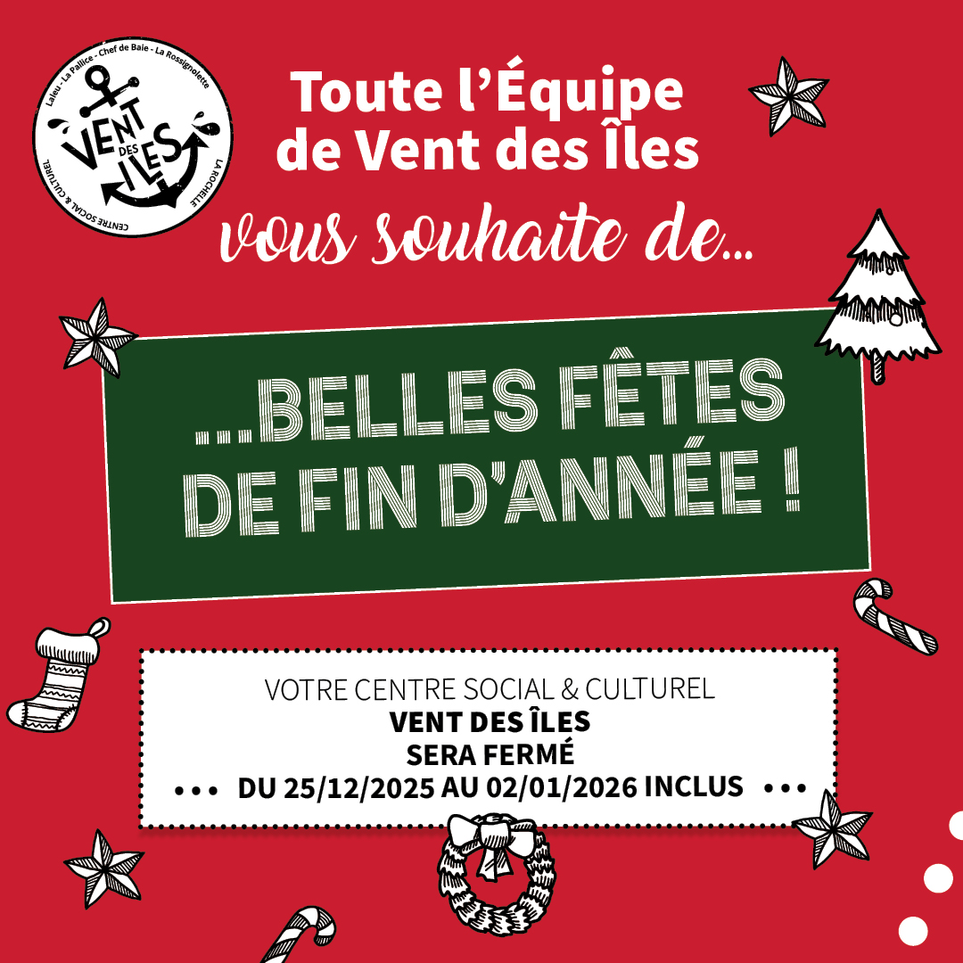 Fermeture fêtes de fin d’année – Centre Social & Culturel Vent des Îles La Rochelle Fermeture fêtes de fin d’année – Centre Social & Culturel Vent des Îles La Rochelle Le 23 décembre 2025 0 No Comments Leave a Reply Cancel ReplyNom * E-mail * Site web Enregistrer mon nom, mon e-mail et mon site dans le navigateur pour mon prochain commentaire. six + = sept Δ Ce site utilise Akismet pour réduire les indésirables. En savoir plus sur la façon dont les données de vos commentaires sont traitées.